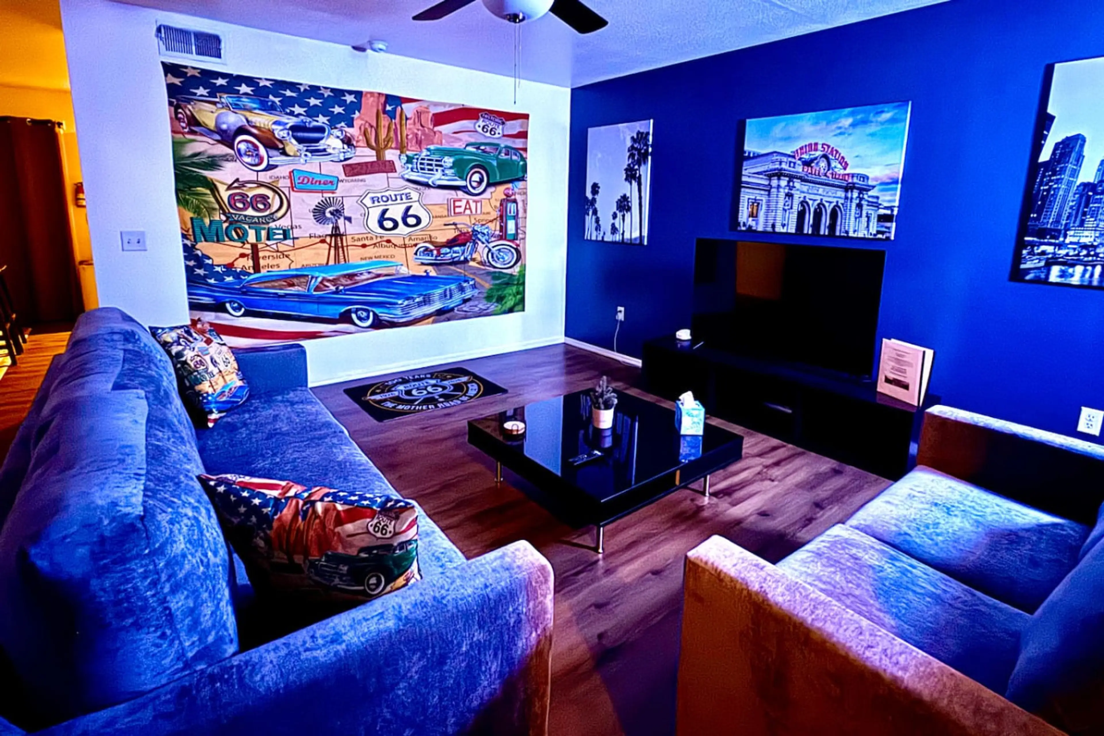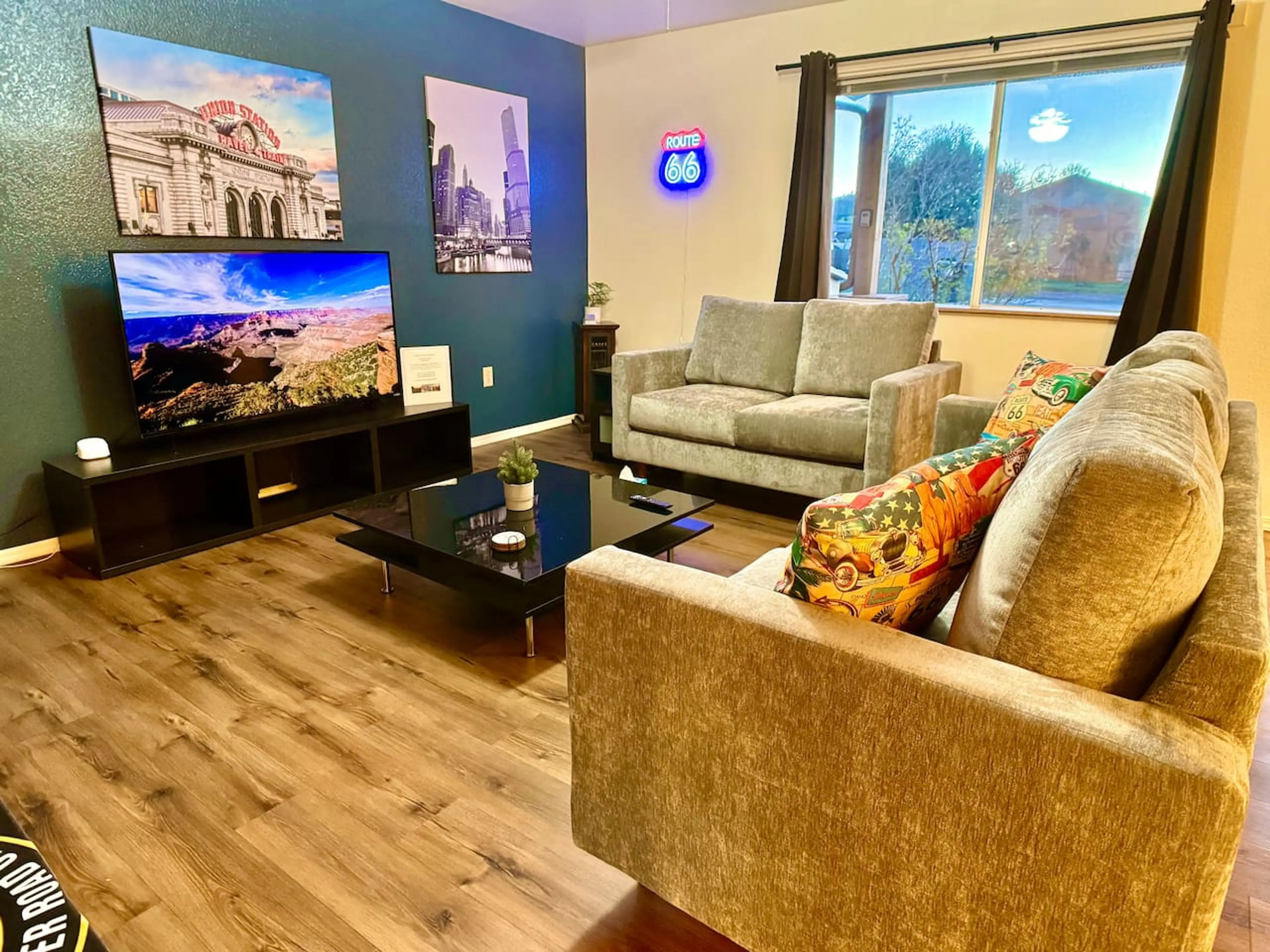 Step into a one-of-a-kind Route 66 experience in Williams, AZ. This thoughtfully designed 3BR home sleeps 6 and features an IG photo wall, Route 66 neon glow, three city-inspired bedrooms from Chicago to Kansas City to Los Angeles, a 65" Smart TV, TV in the primary suite, a fully stocked kitchen, an...